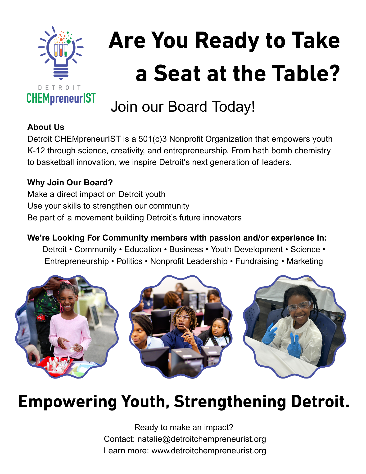 Detroit CHEMpreneurIST is recruiting new board members to help empower the next generation of Detroit youth through science, creativity, and entrepreneurship. We are seeking community leaders with passion and/or experience in Detroit, community, education, business, youth development, science, entr...Read more